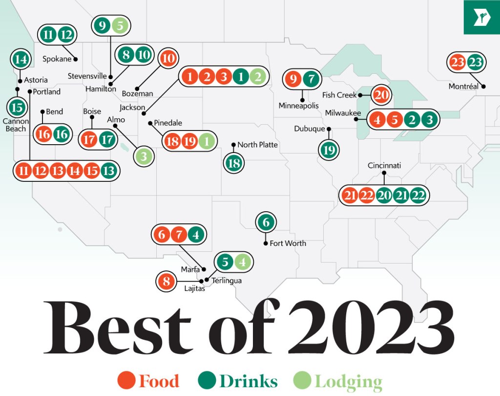 24 dishes, 24 drinks, plus restaurants, bars and lodging options we thought were particularly noteworthy. Interestingly, total “bests” score is Canada 25, US 21, France 6.