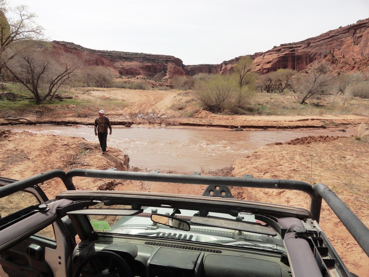 Our guide, Delbert, surveying a river crossing to make sure it’s passable. (The water went up to the grille.)