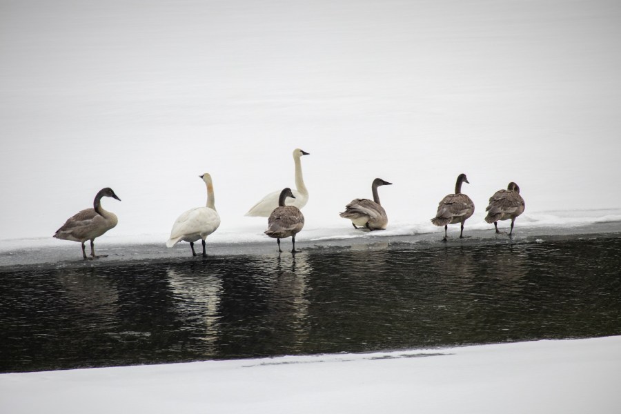 Swan family chilling on the icy Yellowstone River.