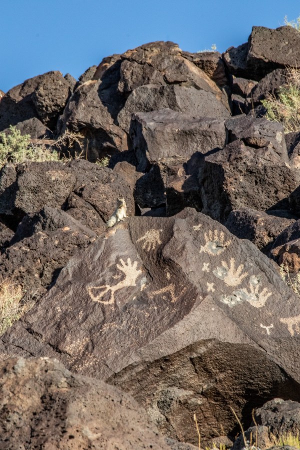 Petroglyph National Monument in Albuquerque, NM contains thousands of inscriptions made by Ancestral Puebloans. The squirrel posing on the rock is not the artist.