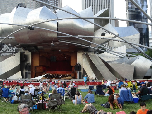 One of our favorite things to do in Chicago during the summer is attend outdoor concerts. The Grant Park Symphony performs three times a week downtown in Millennium Park. We bring a picnic, lawn chairs and blankets, a few bottles of wine, sit on the lawn (which has a fine view of the Gehry-designed stage), and enjoy a wonderful evening of free music. As a fellow concertgoer once exclaimed: “This really is the best America has to offer!”