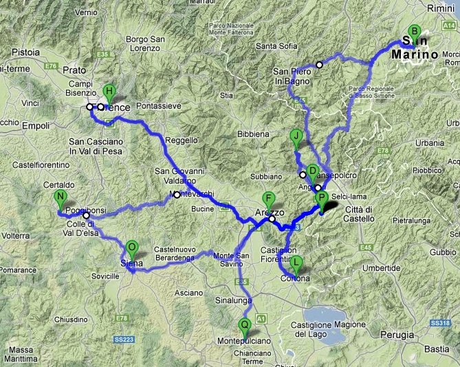 - Google map of our side trips around Tuscany. The villa is the letter P