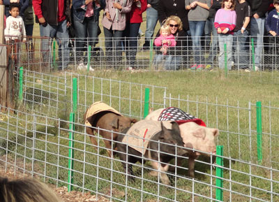 If your idea of a perfect fall day includes s’mores, apple cider, and pig races, then head over to Richardson’s Adventure Farm, home of the world’s largest corn maze! Our friend Hillary rented a fire pit (you bring the food and beer, they build the fire and continuously replenish with wood) and invited us to come up for the afternoon. In addition to getting lost in the maze – this year with a Girl Scout theme to celebrate their 100 years – the highlight of the afternoon may have been the pig races. There is just something funny about seeing animals, clearly not designed to run, race for a donut.