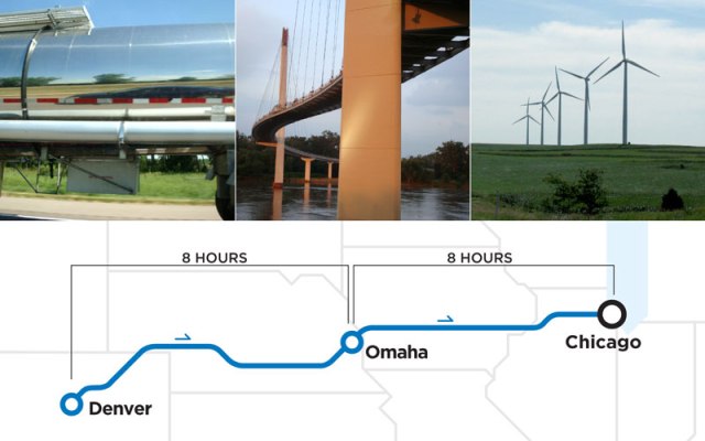 Our two day trek from Denver to Chicago was much more enjoyable than one fifteen hour day. L to R: Our reflection on a tanker truck crossing Nebraska, Bob Kerrey pedestrian bridge between Omaha and Council Bluffs, Wind turbines along I-80 in western Iowa.