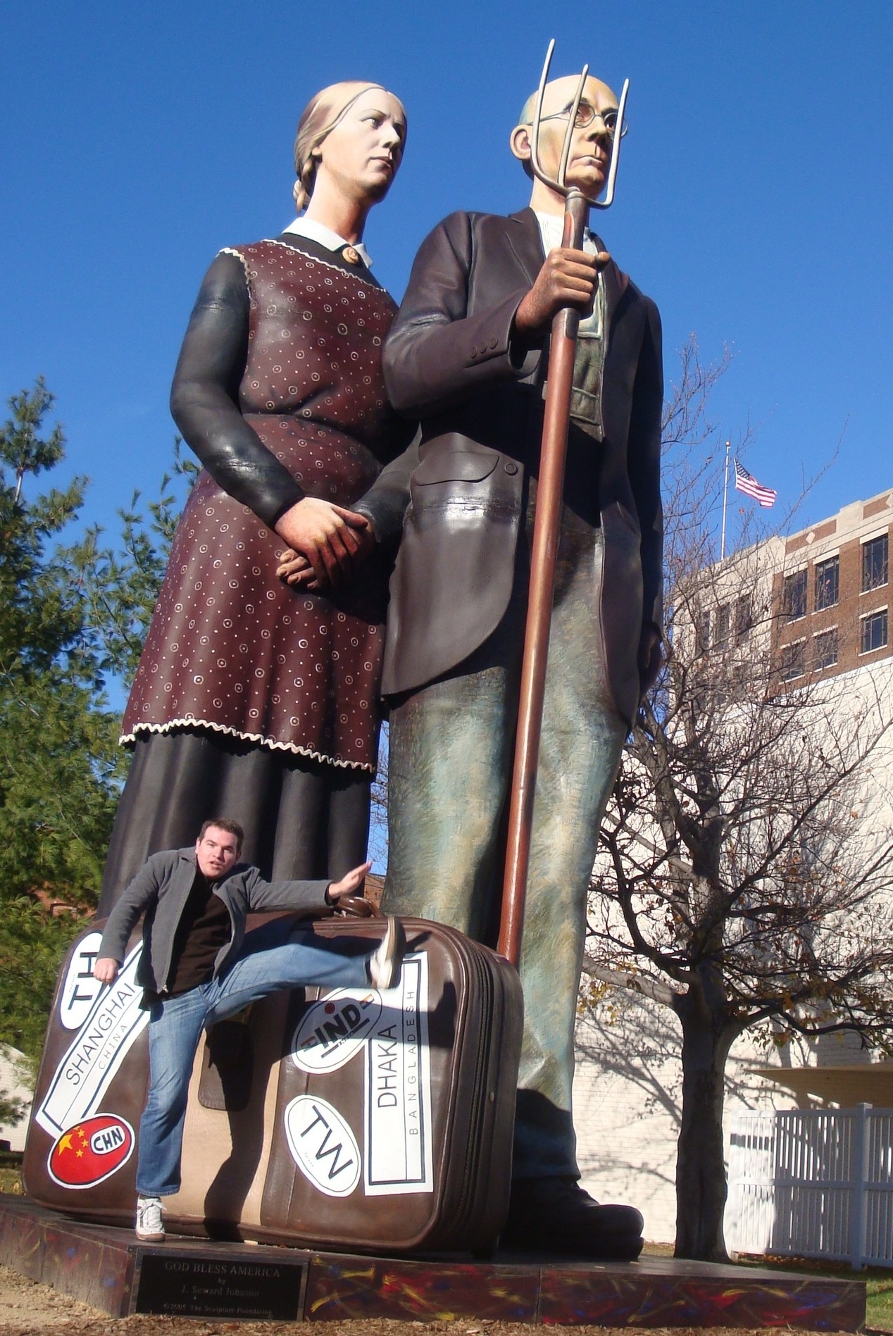 American painter Grant Wood (Feb 13, 1891-Feb 12, 1942) is probably best known for his iconic 1930 painting: American Gothic. While the painting itself is at the Art Institute in Chicago, Seward Johnson’s sculpture “God Bless America” – an homage to the artwork – has been touring the country over the past few years. In October 2010 it was installed in front of the Dubuque Museum of Art, which contains one of the world’s largest collections of Grant Wood artwork. Originally planned for 7 months, the installation is still on display in Dubuque as it keeps getting extended.