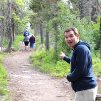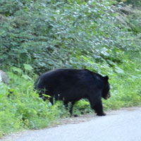 were planning for the next day. Heading back toward the lodge along the road, we heard snapping twigs and saw movement in the trees ahead. We stopped in our tracks … grizzly, 20 yards straight ahead. He or she didn’t seem to notice and/or care about our presence so we just stood quietly. Then “what’s that?” just a few yards behind the grizzly was a large black bear following. As far as we know, this is a rare occurrence, since bears are generally solitary animals. They browsed through the trees and disappeared off to our right, so we continued cautiously on our way. A moment later heard some noise and turned around. They were coming out of the woods and onto the road behind us. They had better things to do than pay attention to a couple of hikers and so continued on their way. It was a cool man/nature moment, but that’s about as close to two bears as I care to get.