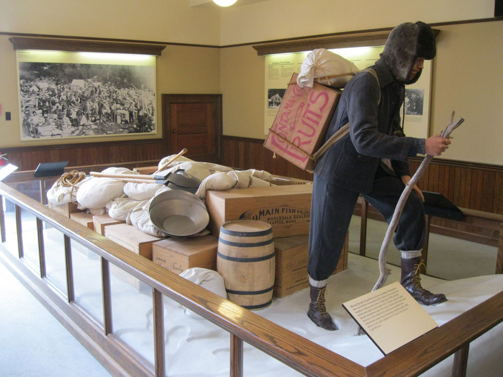 This mannequin displays how much baggage each prospector had to carry up and over the pass by hand.