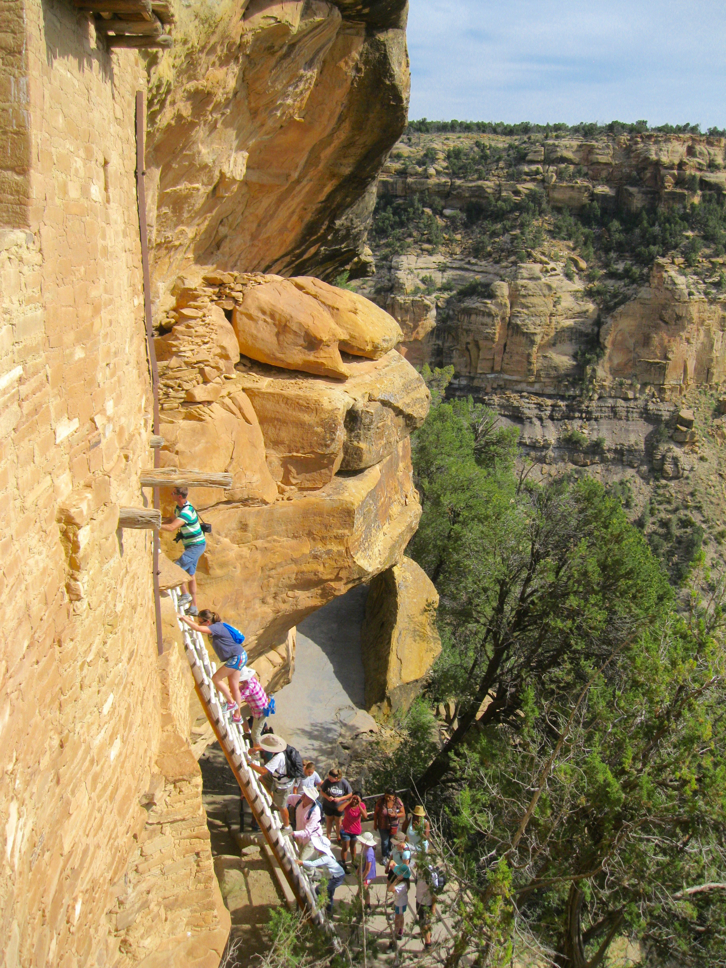 To tour Balcony House, guests must climb this 32 foot ladder. To exit a crawl through an 18-inch wide tunnel is required.