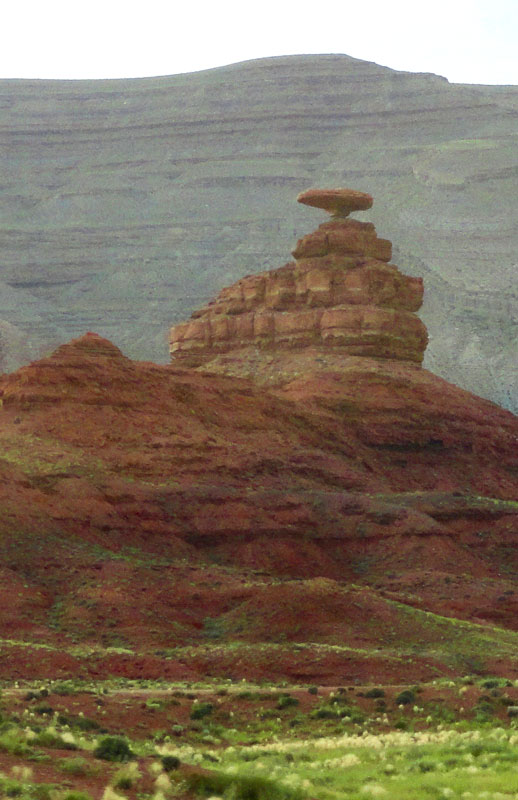 Continuing west another hour and a half brought us to the famous Monument Valley of Arizona and Utah. Admission is $20 per car for up to four people and $6 for each additional person. Like Four Corners, it’s run by the Navajo Nation so it doesn’t have quite the level of services, interpretive exhibits or programs expected from the National Park Service, but the scenery is truly unique. Giant sandstone buttes rise up to 1,000 feet from the valley floor all around. From the visitor center the famous “mitten buttes” are front and center. A 17-mile unpaved loop road is open to the public to get farther into the valley. It is very rough in places, making it a slow trip unless you’re in a large four wheel drive vehicle. Guided tours in open trucks would be a fun but dusty alternative to driving yourself. Temperatures were hovering right around 100 degrees when we were there on July 2, so any hiking was out of the question. The rock is red, the dirt is red and your car will be red after driving the road, but it’s a great way to get up close to the formations. Many Western movies were filmed with Monument Valley as a backdrop, helping making it he standard landscape people think of when they envision the American West. Director John Ford used the Valley for several of his films and now for $5 you can have your photo taken on a horse at John Ford Point (why did we not do that?). Our next lodging stop was just a half hour away in Mexican Hat, with the skyline of Monument Valley in the rearview mirror nearly the whole time. We’d later come back to this section of Highway 163 to watch the sunset.