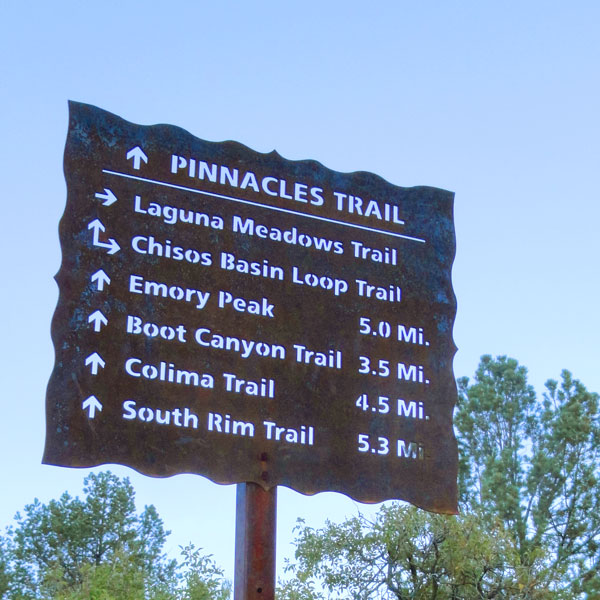 Mexico, with the huge opening of Santa Elena Canyon looking like a small crack from this distance. The South Rim Trail follows the edge of this bluff for about a half mile. We took a break under a tree to enjoy the picnic lunch we brought from the Basin Convenience Store with the spectacular view before us. Peregrine Falcon nesting season means a longer stretch of the trail along the edge is closed seasonally, so we had to begin our descent on the Boot Canyon Trail. This canyon has great scenery of its own, with rocky outcrops and more thick forest than we expected. After rounding a bend, the rock formation that gives the canyon its name comes into view. It looks as if some giant cowboy took an unfortunate tumble and ended up with one boot sticking straight up in the air. The trail then rises for a while before arriving at the top of Pinnacles Trail. At this point, 9.5 miles in, we were faced with a view of the lodge in the distance and the realization of just how far down we had to climb to get there. The top of Pinnacles Trail is also where the route to the summit of Emory Peak splits off. We briefly considered making the 1.2 mile trek up there, but it’s really too much to do both the South Rim and Emory in one day. Also, we remembered there was beer in the fridge. We downed a few of those on our porch and then had dinner back at the lodge restaurant. Later that evening we took in an always-informative ranger presentation in the campground amphitheater led by Ranger Jeanette on the top ten things that make Big Bend special.