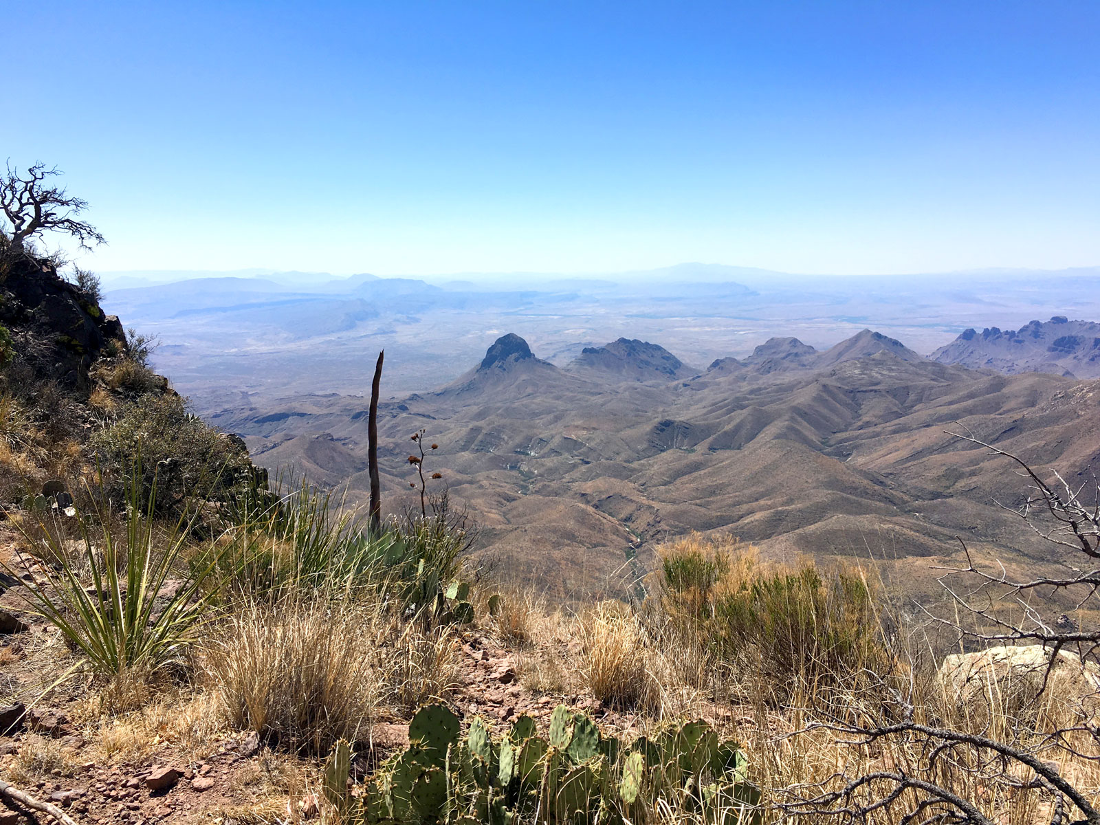 Arriving in the evening on Friday, we only had time to wander around the short Window View Trail and have dinner before it was time to head to bed. The following morning we set out on the first (and longest) hike of our entire trip, a 12 mile loop to the South Rim and back. Who needs a warm up hike? The South Rim is the high bluff of the central Chisos mountains, looming thousands of feet over the desert below. The view is widely considered to be among the most scenic in Texas. We began by heading up the Laguna Meadows Trail. It seemed more people went the opposite direction, starting up the Pinnacles Trail and making their way down Laguna Meadows. We found Laguna Meadows to be slightly less steep, but it’s a pretty big climb either direction, a little over 2,000 feet in elevation gain from the basin to the high point. The trail is fairly level at first, but starts gaining elevation quickly after the first mile. Soon we looked back and could see the whole Chisos Basin below us. After the major climb, the trail curves around the west side of Emory Peak (the highest in the park) and heads across the slightly more level Laguna Meadows. Around the six-mile mark is the view everyone goes to see. As you approach the rim, the mountain falls away and the view opens up. In the foreground stands ridge after ridge of peaks and valleys. The sightline extends to the Rio Grande and beyond into