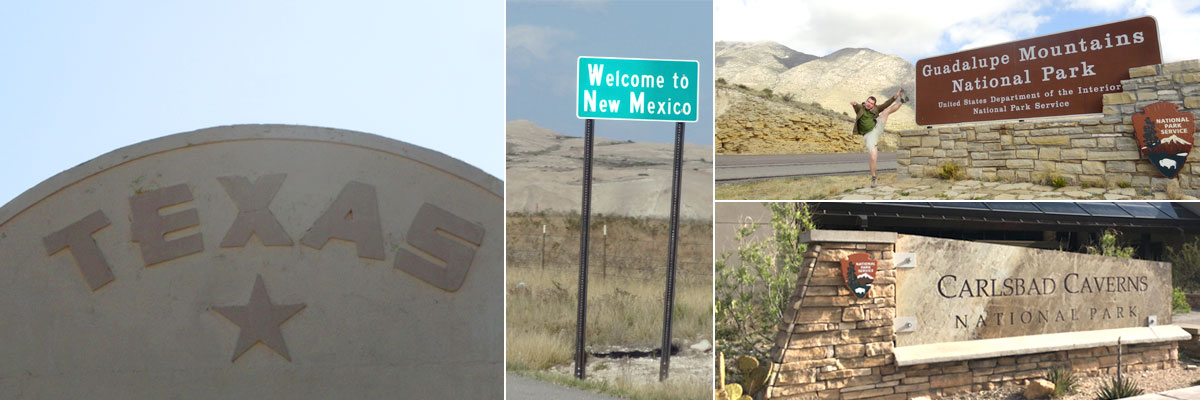The high point is marked by a stainless steel pyramid commemorating the Butterfield Overland Mail route. From up there the view is amazing, with the green swath of the Guadalupes to the north and the wide Delaware Basin stretching off to toward the east. To the west, a field of gypsum sand dunes in the park is visible as well as some circular, irrigated fields in the distance. An old ammunition box serves as a summit log, with a book to sign and assorted mementos left by previous visitors. I dropped a highkicktravel business card in there for a future hiker to discover. There was only one other person at the top when we arrived, and he left shortly after, so we had the peak to ourselves. For our summit picnic lunch, we packed sandwiches from a Subway in Van Horn. (Mental note: go ahead and get the footlong sub when planning to hike several miles.) After taking in the view for about 45 minutes, we turned back to the trail. I always debate whether climbing up or going down is more difficult, but I’d say it’s about even on Guadalupe Peak trail. The nearly constant grade is tiring in both directions. We must have been taking more time to look around on the way down, because we both commented several times “I don’t remember this part on the way up.” Nearing the home stretch, several mule deer appeared in our path, so we all stood in mutual curiosity for a few minutes before they bounded off into the brush. After returning to the car, we continued up Highway 62 across the border into New Mexico.