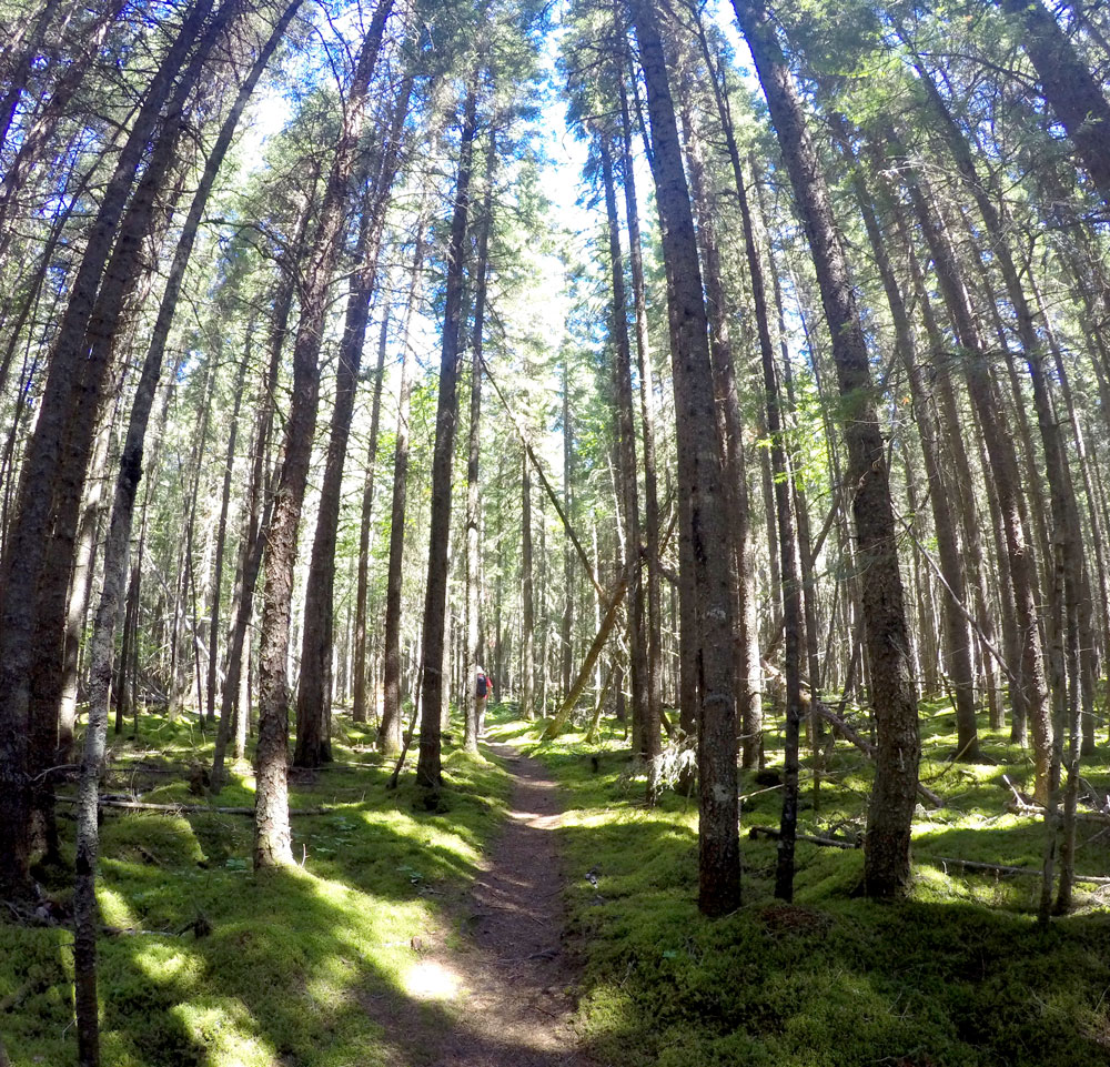 multi-day camping trip and is probably the park’s signature attraction. Being there just for the day, our plan was to hike the first segment of the coastal trail as far as the White River, a trip totaling 16 kilometers. Beginning at the visitor center, the trail heads through the forest alongside Hattie Cove. The start is fairly level, with some sections of trail on planks to protect from mud. A couple kilometers in, the trees open up and the trail crosses a large wetland on a long boardwalk. At the far side of the wetland, the trail re-enters forest and passes through some rocky sections. The last couple kilometers