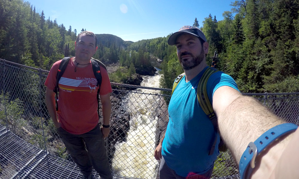 before the White River pass through a pine forest carpeted in fluorescent green moss. At kilometer 8 the trail crosses the river in spectacular fashion on a 30-meter-long metal suspension bridge hanging 23 meters above a set of rapids. The views are amazing and the swaying bridge is an adventure. We spent a while crossing back and forth looking for the best photo opportunities before settling on the landing to eat our packed lunches. The solitude here rivaled that of Isle Royale. We only passed two hikers on the outbound trip and met a group of four while eating lunch. On the way back, we passed two hikers, one dog and a porcupine who didn’t want anything to do with us and waddled away in a minor panic. After buying a couple souvenirs at the visitor center, we hit the road to complete the Canadian segment of Lake Superior.