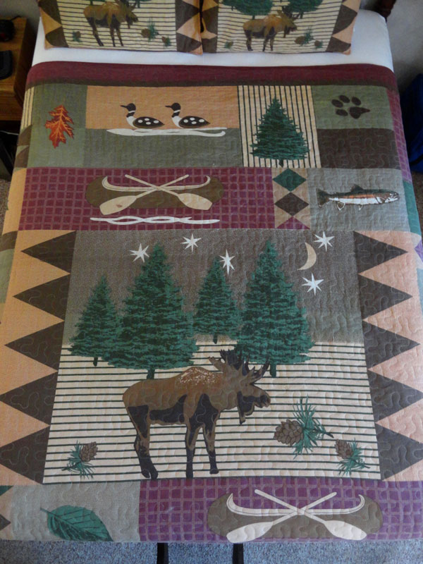 Pictured Rocks Cruises, departing the Munising dock at 7:00 pm. The trip was wonderful, but one thing to keep in mind is that Munising does not have many options for late evening dining, so plan to eat ahead of time or order a giant pizza from Main Street Pizza afterwards like we did. Our lodging was at the Terrace Motel, which had friendly service, a lounge in which to eat the aforementioned pizza and one of the best bedspreads of all time (see at left).