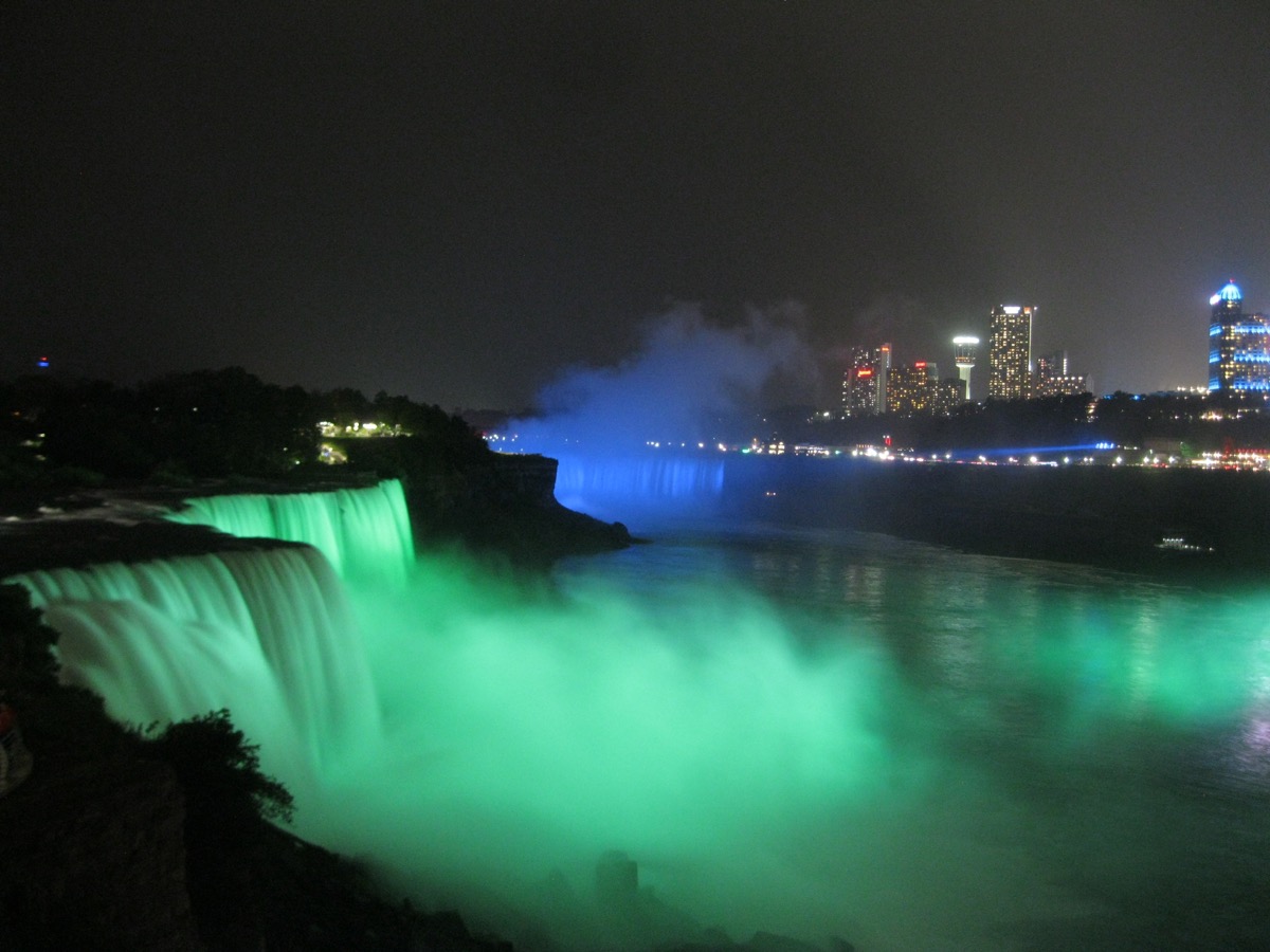 At night a fireworks display takes place in the gorge while the falls are lit by color-changing spotlights.