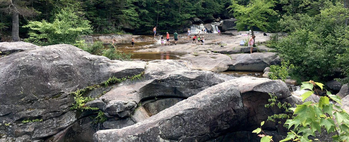 If we’d been able to do a longer day hike, taking the Appalachian Trail to the summit of Old Speck, Maine’s fourth highest peak, would have been a great option. Instead, we joined the rest of the group to visit some of Grafton Notch’s more family-friendly sights. Just off the main road there are lots of things to see that require minimal walking. The best is Screw Auger Falls, where the Bear River has cut a narrow, twisting gorge through granite. The main drop is 23 feet high, and above and below are a series of smaller cascades. There is a lot of smooth, exposed rock for lounging and several people were wading in the cool water when we visited. It’s a great picnic spot as well. Just over a mile further north is Mother Walker Falls, where the Bear River tumbles over several small cascades at the bottom of a gorge. It’s not as impressive as Screw Auger, but worth a quick stop if you’re not in a hurry. Nearly back to the Appalachian Trail parking area is Moose Cave, a 0.4 mile loop through a mossy forest to a place where a slab of fallen granite has created a “cave” that the river flows through. This was a great one for the kids.