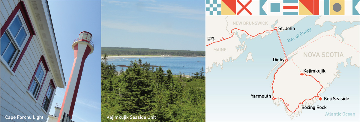 Kejimkujik National Park (known usually as Keji for pronunciation purposes) contains two sections, the main portion in the remote interior of Nova Scotia and the smaller Seaside Adjunct section about 90 minutes to the south. We approached the seaside section first, so planned to make a quick visit. This section protects beaches, bogs, and lagoons, along with an abundance of coastal wildlife. There isn’t a visitor center at this outpost, but there are some nice trails that lead a few kilometers to the shoreline. Nearing the end of the Harbour Rocks Trail, a stunning view of tranquil, turquoise water and sandy beaches spread out before us. Just off shore, seals relaxed on rocks jutting out of the water. We were glad we didn’t skip this section of the park.
