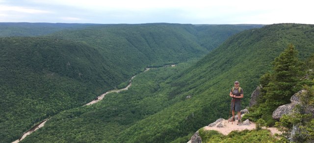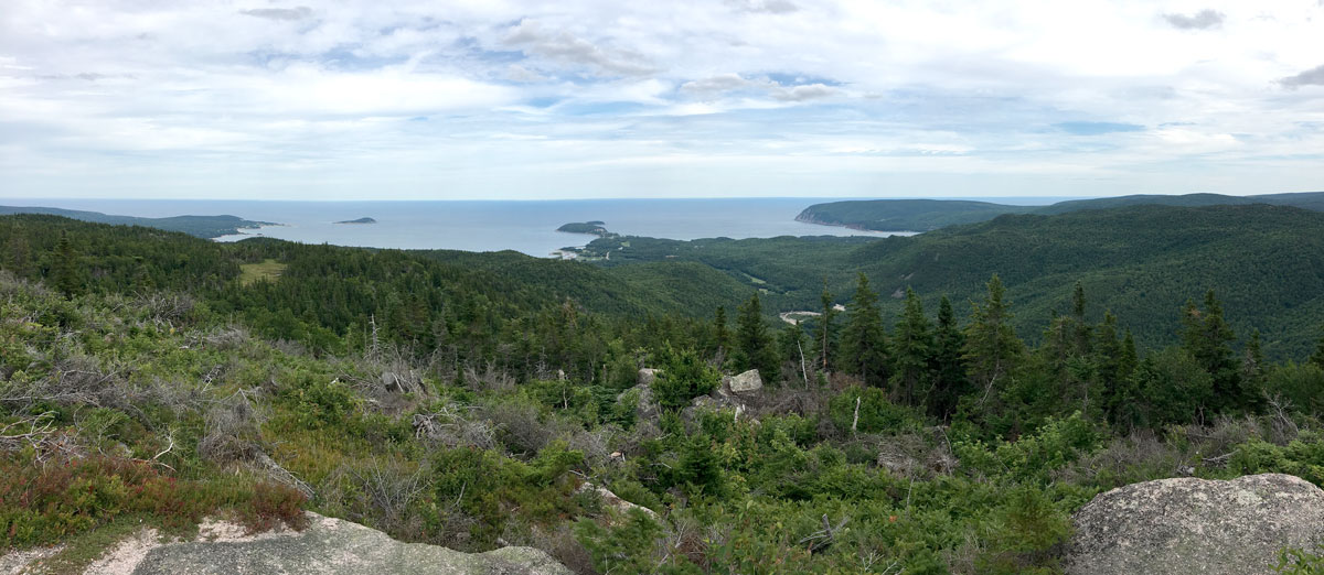 Departing Neil’s Harbour, we intended to go to the Mica Hill Trail, but the road was closed from the other direction as well. Instead, we continued southbound to our other preferred option, Franey Mountain Trail. This 7.5 kilometer trail with its 335 meter elevation gain is known as one of the more difficult hikes at Cape Breton Highlands. The trailhead is accessed via the short, steep and gravel Franey Road at the town of Ingonish Centre. The route is a loop with the two ends departing different sides of the parking area. We weren’t sure which one to choose, so we randomly started down the left path into dense forest. The first couple kilometers are typical immaculately maintained Parks Canada crushed gravel. It’s a constant incline, but not overly strenuous. Moving along, the trail gradually becomes more rugged, passing through hardwood Acadian forest. About a kilometer in, a viewpoint gives the first clear panorama into the beautiful Clyburn Brook canyon. As far as the eye can see, a green carpet of uninterrupted trees blankets the land. Above this point some of