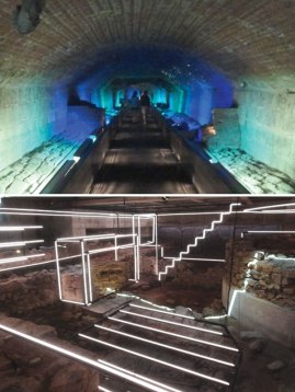 Top: Old sewer system. Bottom: Lights highlighting the hearth, floorboards and stairway of a former building.