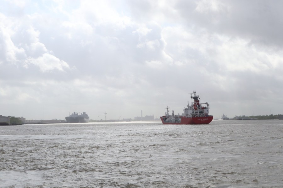 The Mississippi river is enormous and fast-flowing as it flows through the city.
