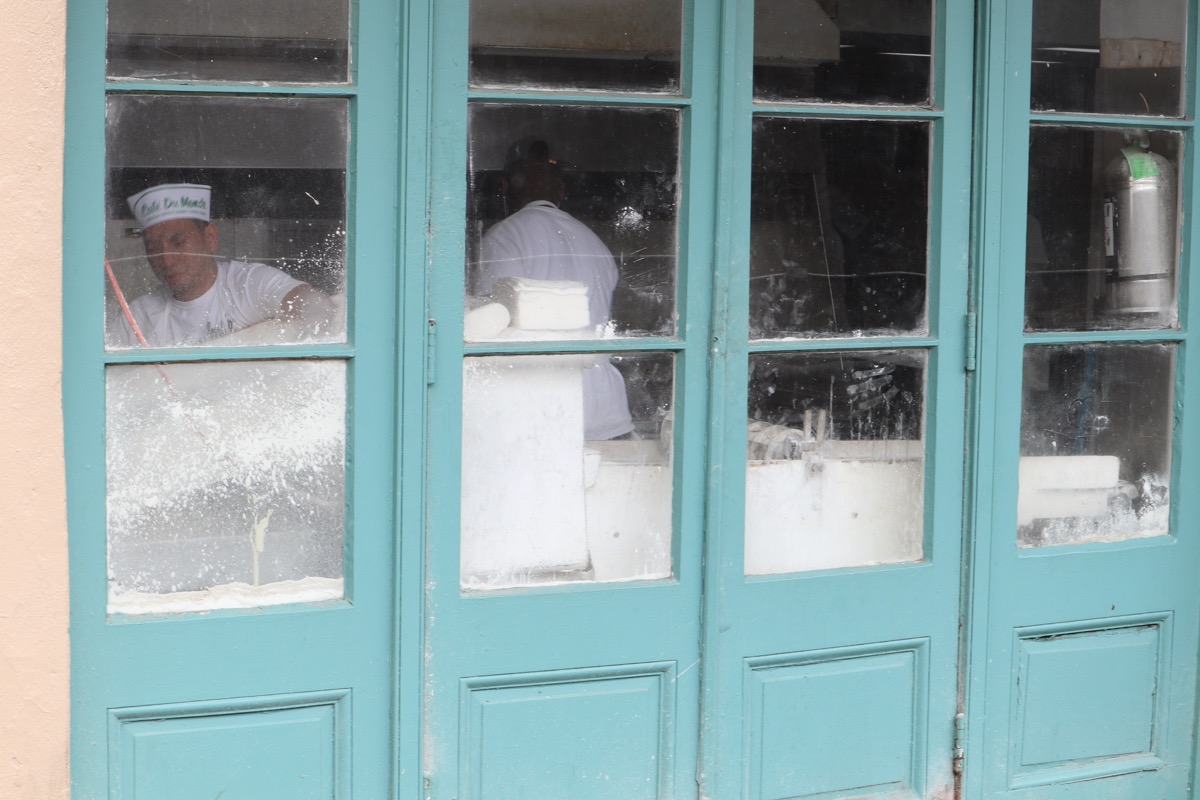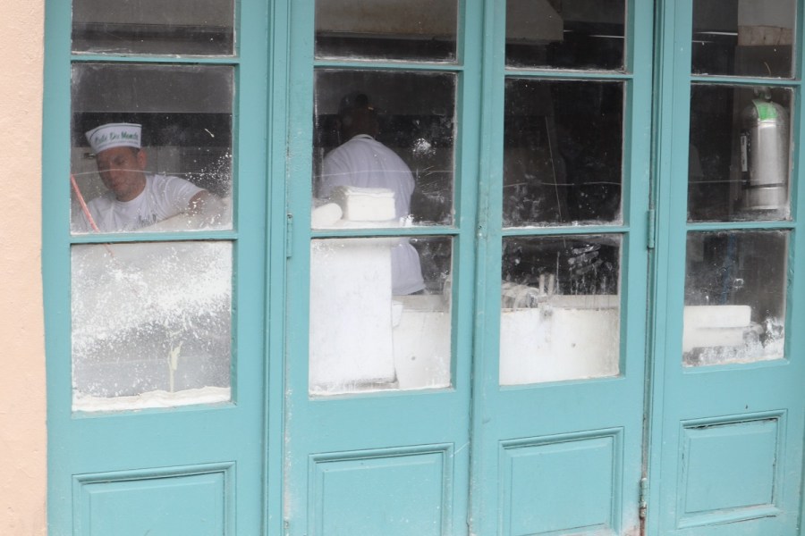 Back windows of Cafe du Monde. Powdered sugar galore!