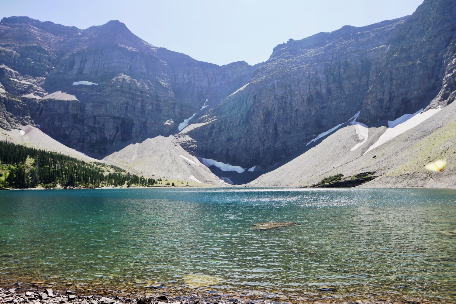 The hike ends with a loop around Crypt Lake. The big wall of rock in the background is in the United States.
