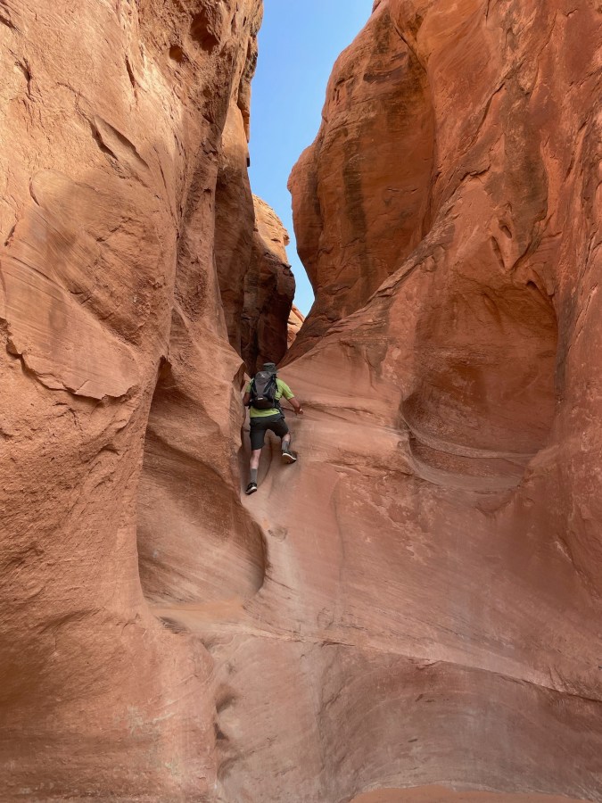 Climbing up the 12 foot wall at the entrance to Peek-a-boo slot canyon. 26 miles of rough road south of Escalante, UT.