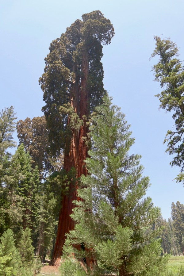 Mature sequoia in the background and a baby in the foreground, their appearance varies dramatically with age.