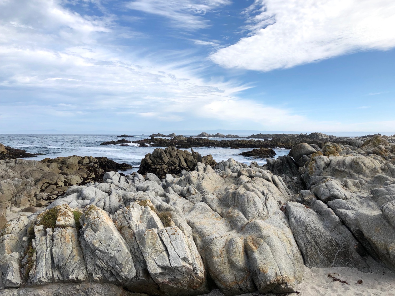 Rocky coastline and tide pools in Pacific Grove, CA.