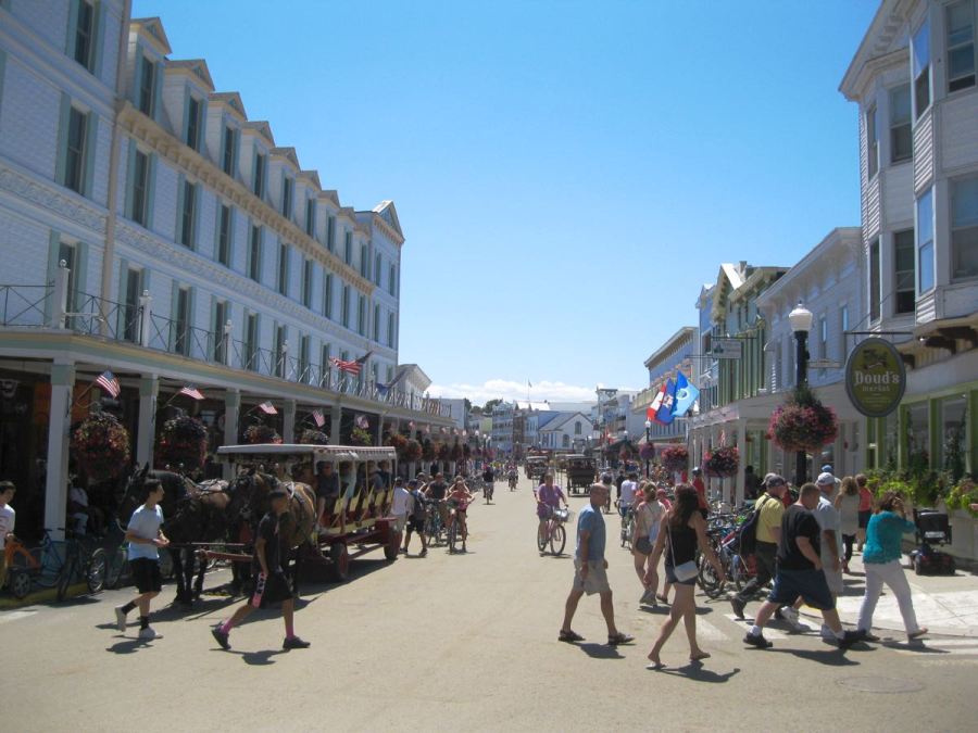 Mackinac Island is a popular tourist destination and is famous for not having any cars. All visitors arrive by boat and get around the island on foot, in a horse-drawn carriage or on bikes.